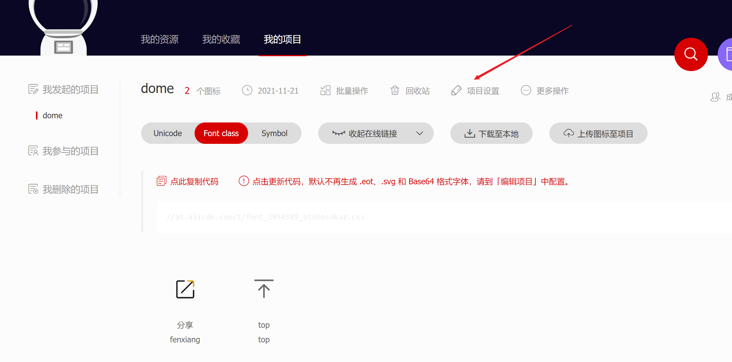 1 先建空项目,2搜索想要的图标,3加入购物车,4生成代码 ,5在项目里的index.html引入 使用 link-css标签 将复制生成的代码替换href的路径 6用在标签的class上 前缀加 iconfont 后面复制得到的图标名称 在"项目设置里"可以修改前缀 修改(Font Family),上面那个不改就让是空 FontClass/Symbol 前缀